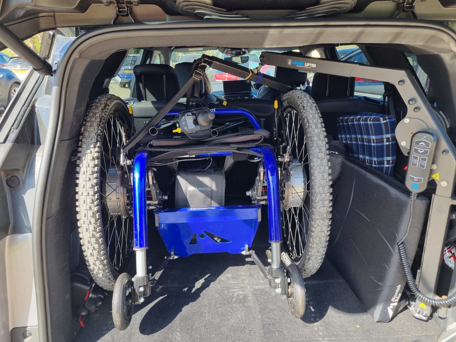 A trike conversion adds a powered third wheel and turns your wheelchair into a longer, more stable setup. The larger front or rear wheel gets you over bumps and loose surfaces with much more control.