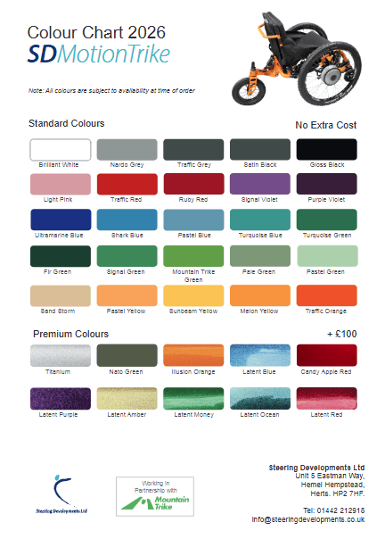 With a choice of 35 frame colours, your trike can be as individual as you like!