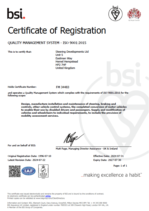 SDMotion is the trade name for our wheelchair side of the business at Steering Developments. We have been in business for over four decades and take great care in the quality of our workmanship and looking after customers. We are registered to BSI ISO 9001
